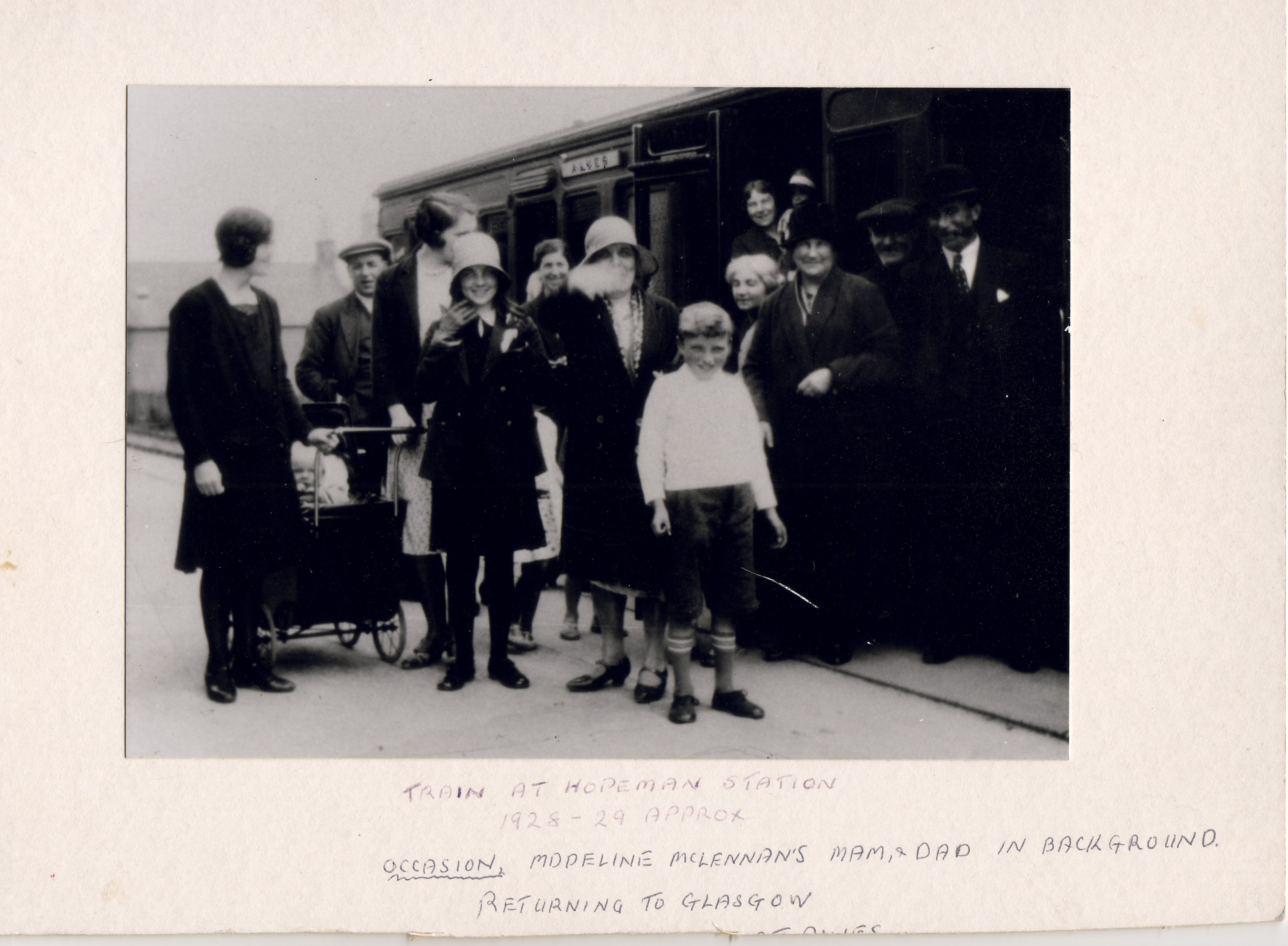 1928- Madeline McPherson parents returning to Glasgow. Note sign on carriage with destination ALVES.