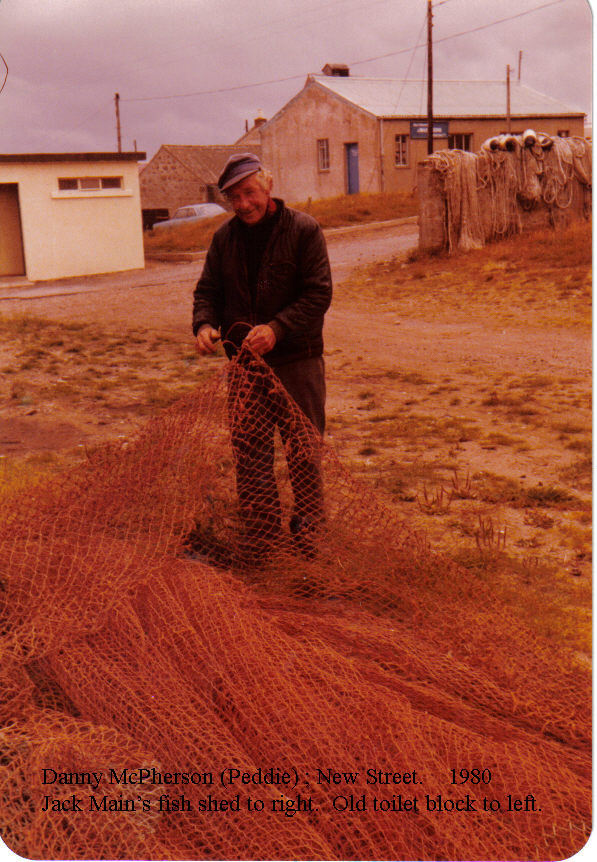 1980 – Daniel McPherson (Danny Peddie) son of Wull Peddie, New Street. Repairing a net in Hopeman