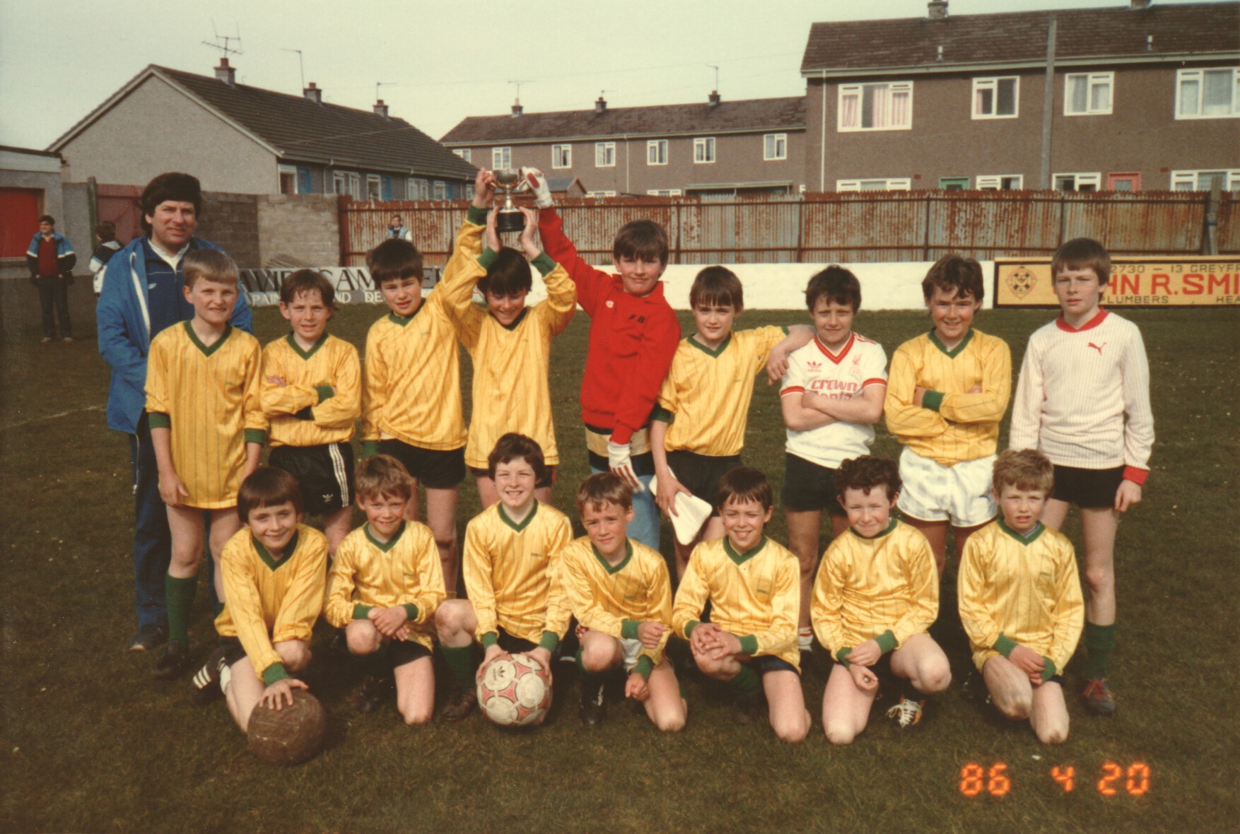 1986 -Boys Brigade football team -Sandy Main (Coach) -John Herriot, Scott Sutherland, Ryan Edwards, Lorne Davidson, Douglas Barclay, Kiel McPherson, Mark Stewart, David McPherson, David More. Front -Colin Young, xxxx, Scott McPherson, Neil McPherson, Stewart Sutherland, Martin Lilly, Alistair Jack.